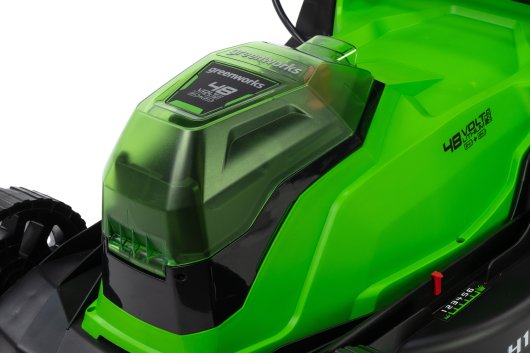 Газонокосилка имеет усовершенствованную систему и питается от двух аккумуляторов 24V, что дает выходное напряжение 48V. Благодаря этому скорость холостого хода составляет 3 600 об/мин. Ширина среза — 41 см, вес устройства без аккумуляторов всего 18 кг. Высоту среза можно регулировать от 25 до 80 мм. Все это позволяет легко и быстро обрабатывать небольшие территории.