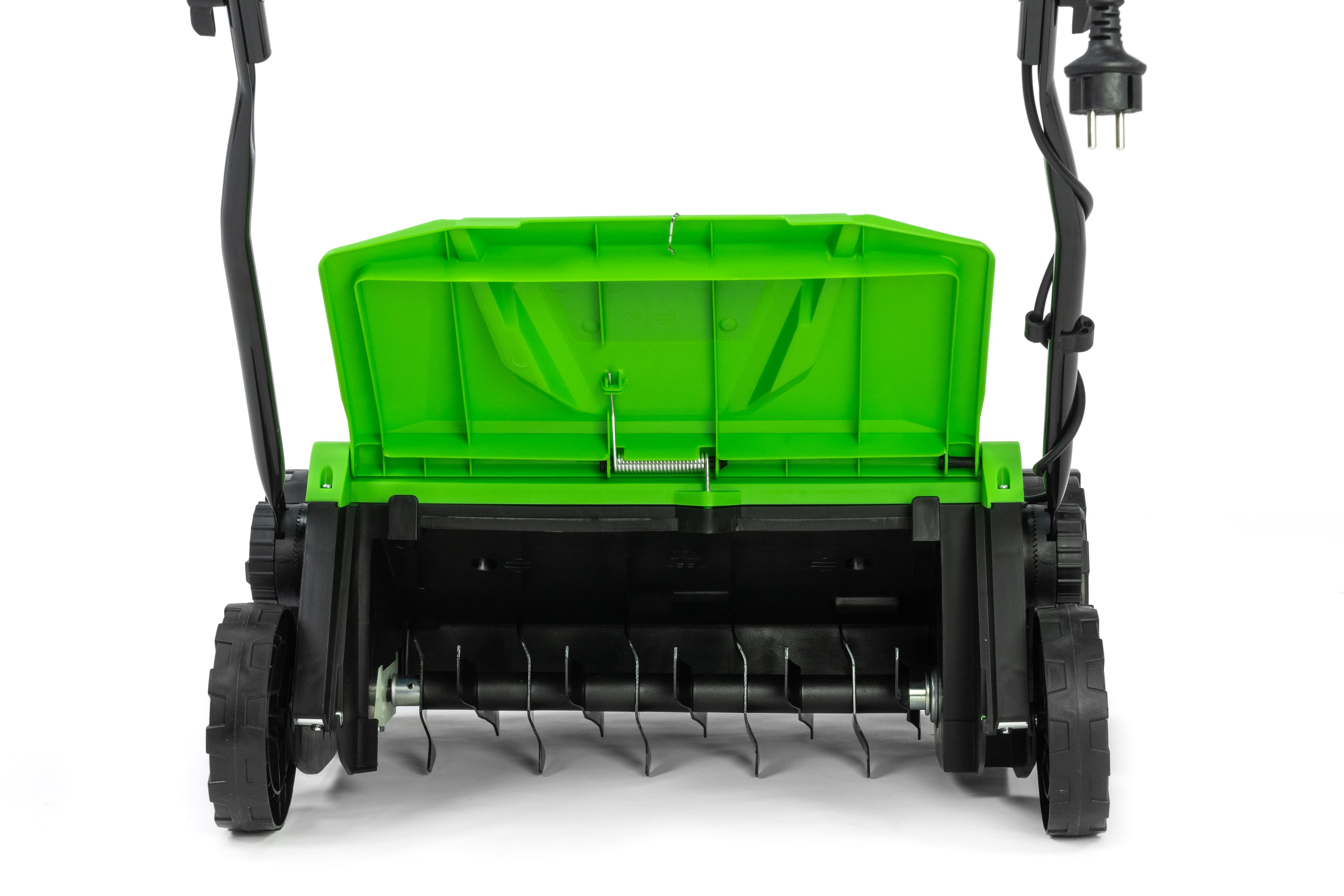Мощный электрический аэратор, со скоростью вращения вала 3 200 об/мин и с шириной обработки 36 см даст вам возможность легко и быстро обрабатывать большие площади вашего газона. У модели есть 2 заменяемых вала для аэрации и скарификации. С помощью вала со спицами можно вычесать газон, а также проколоть верхний слой почвы, чтобы она получила необходимые минералы. Благодаря зубчатому валу, устройство можно использовать в качестве грабель. Глубина обработки регулируется 5-ю положениями: 12, 9, 6, 3, 6 мм. Это позволит убирать мох, сорняки, остатки растений, сухую траву, собирать листву и прочий мусор с газона.