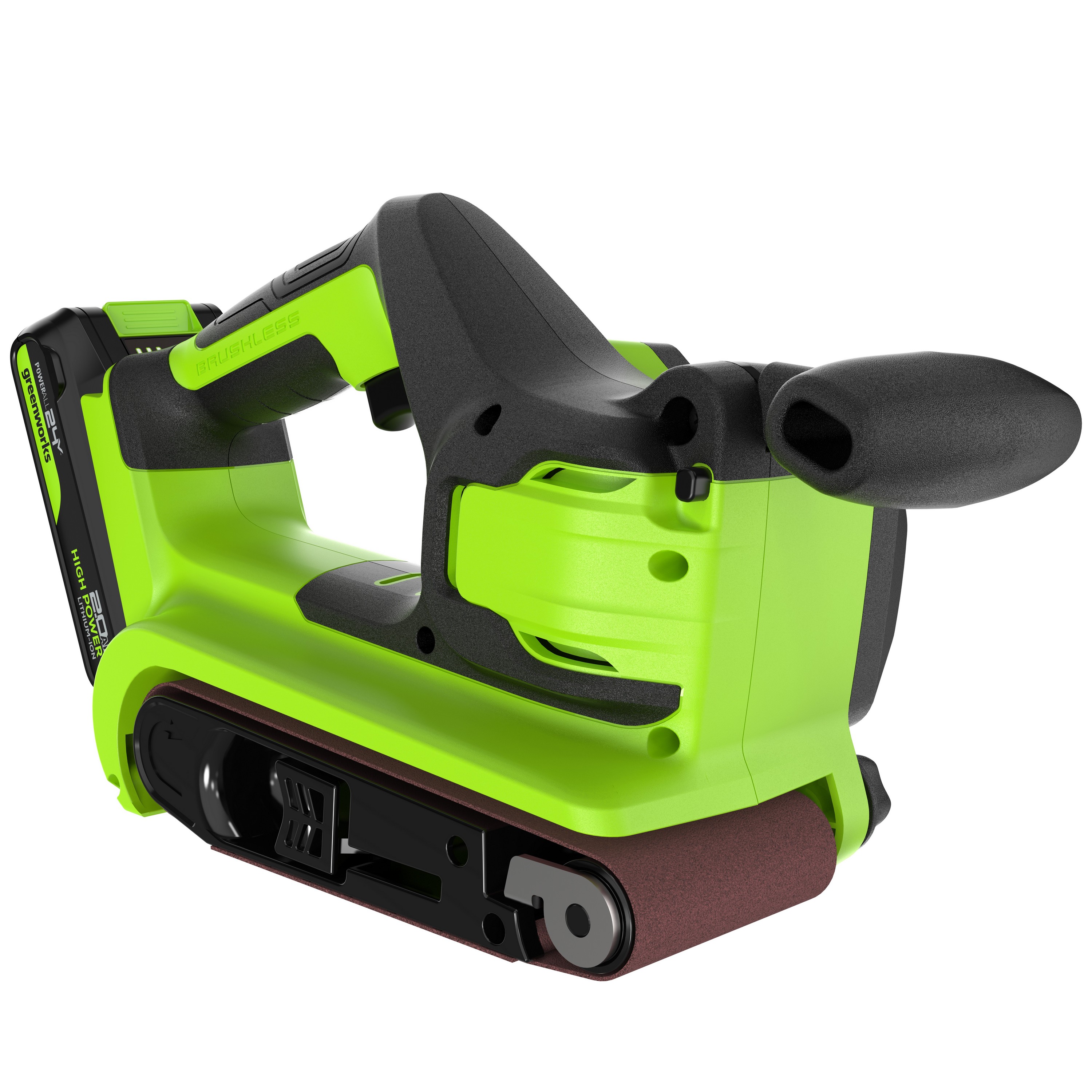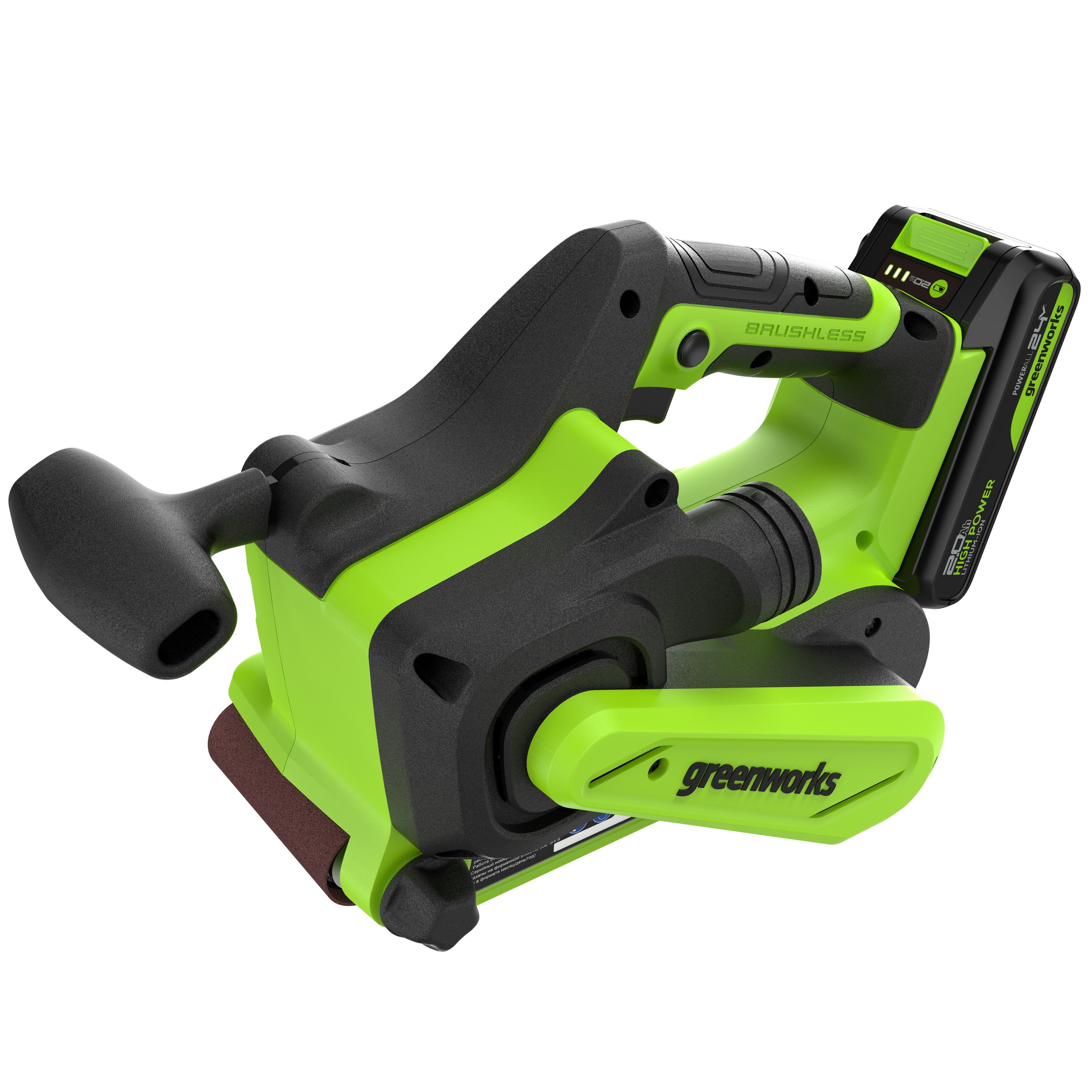 Аккумуляторная шлифовальная машина Greenworks G24BS с АКБ 2 Ач и ЗУ – это высокоэффективная ленточная шлифовальная машина, предназначенная для обработки разнообразных материалов, включая дерево и его производные, полимеры, металл и шпонированные изделия. Эргономичный корпус оснащён нескользящими вставками для уверенного и комфортного использования. Выбор абразивной ленты зависит от требуемого результата: