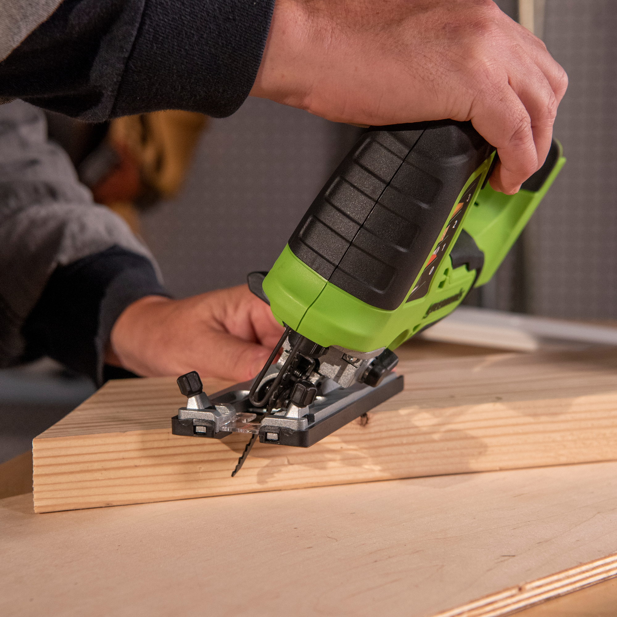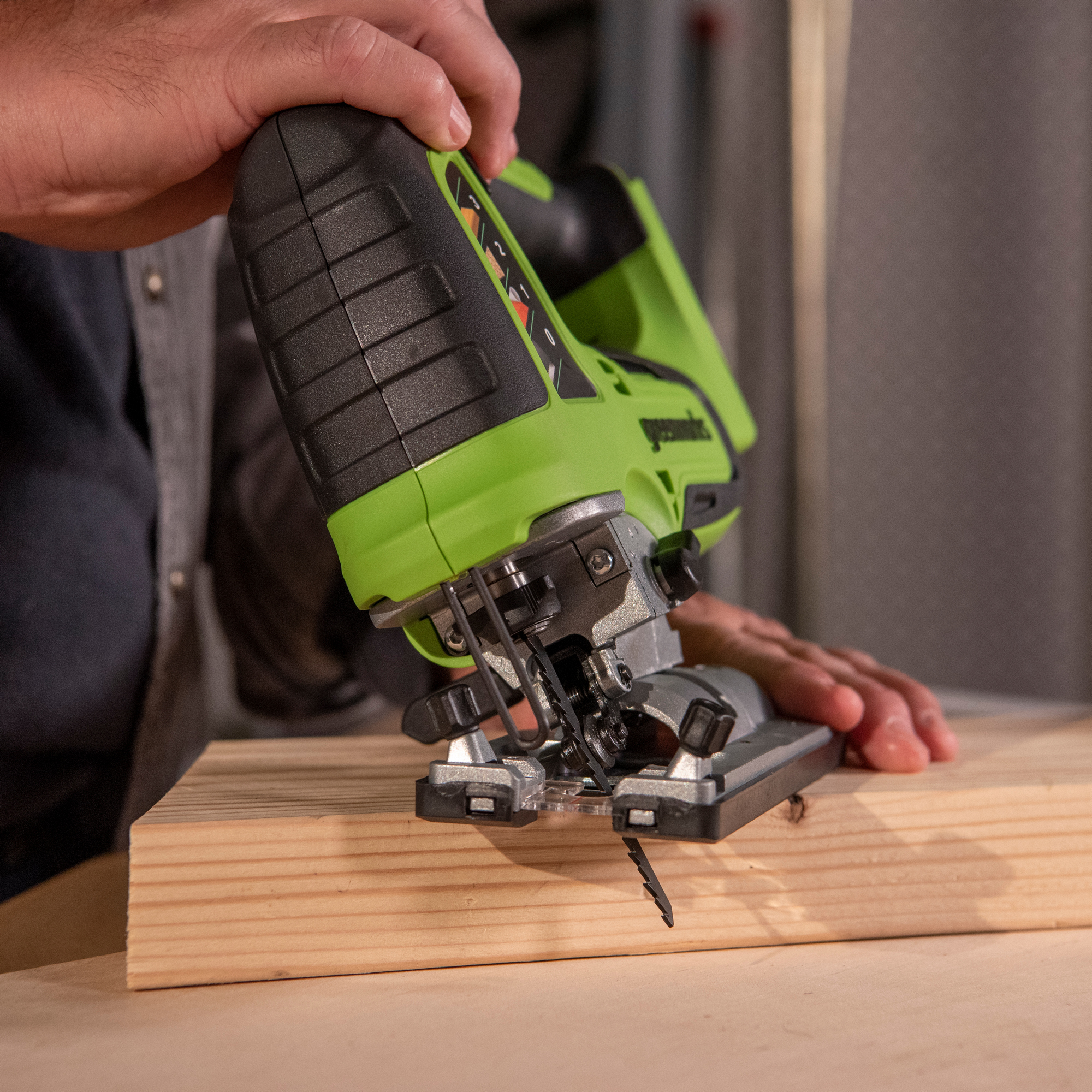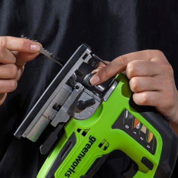 Электролобзик Greenworks GD24JS – это универсальный инструмент для отделочных и монтажных работ. Этот компактный аккумуляторный лобзик оснащен мощным бесщеточным двигателем, позволяющим быстро и аккуратно распиливать древесину толщиной до 100 мм. Классическая закрытая конструкция рукоятки обеспечивает привычный и комфортный хват для оптимального контроля в процессе работы. Корпус имеет нескользящее покрытие в местах удержания. В целях безопасности GD24JS оснащен выключателем с блокировкой случайного включения. Он совместим с любыми пильными полотнами с Т-образным креплением.