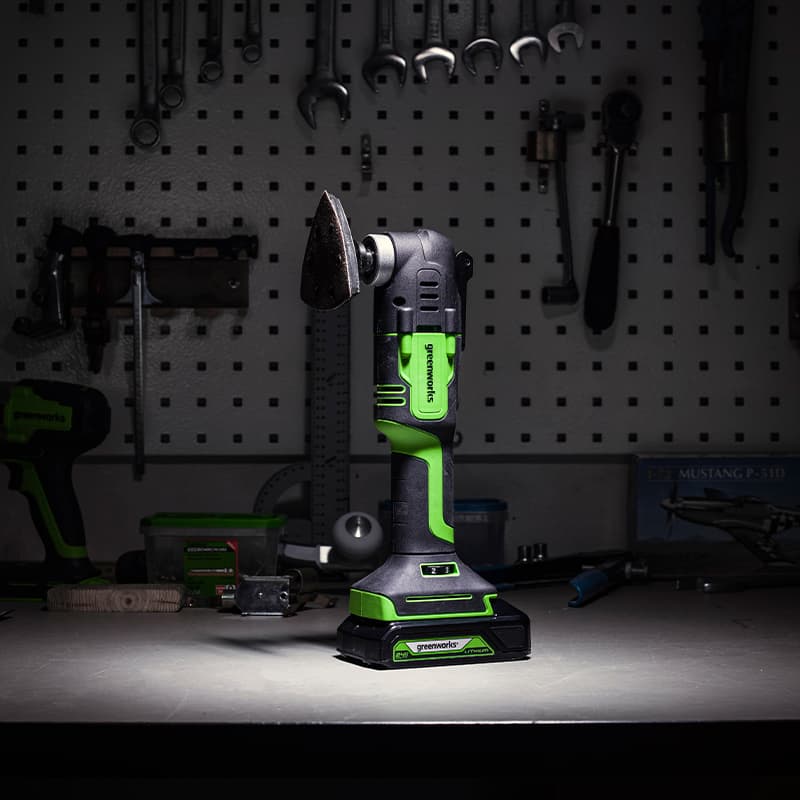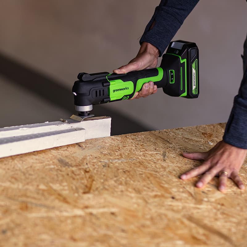 Аккумуляторный реноватор Greenworks G24MT 24V 3400307 — универсальный инструмент для резки дерева, пластика, металла, гипсокартона, композитных материалов и чистой шлифовки.