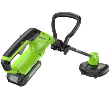 Это самый легкий и малогабаритный триммер в ассортименте Greenworks 24V. Он превосходно справляется с кошением травы на небольших территориях и в сложных для доступа зонах, где применение газонокосилки может быть проблематичным – например, на тесных тропинках или участках с неровным рельефом. В поставку включены 20 пластиковых лезвий.